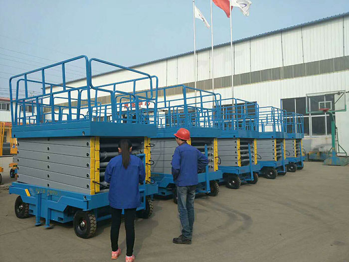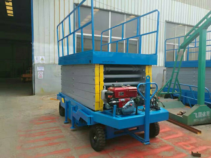 移动剪叉升降机是用途广泛的高空作业专用设备。它的剪叉机械结构,使升降台起升有较高的稳定性,宽大的作业平台和较高的承载能力,使高空作业范围更大、并适合多人同时作业。升降动力分为220V或380V电源,柴油机,或电瓶动力源,特殊环境也可采用防爆泵站及防爆电器。升高4—22米,载重0.3—3吨。采用意大利和国产液压泵站,台面使用防滑绝缘扣板,具有防滑,绝缘、安全,请放心使用。它使高空作业效率更高,安全更保障。<--适用范围-->移动剪叉升降机广泛应用于市政路灯维修维护、交通、电力高空作业、小区路灯维修维护、电力高空架线、交警监控维修维护、车间灯具维护、物业小区高空作业等方面。<--优势-->1、设有升降台超载液压安全保护系统的液压剪叉式升降台,升降台主结构采用高强度锰钢矩形管制作,强度高,坚固耐用。2、有底座、臂架和工作台三部分组成。底座采用相应强度钢板焊接而成;臂架为剪撑铰链式垂直升降。3、设有防止管路爆裂的防坠安全保护系统。4、设有停电时应急下降的手控下降阀。5、采用精磨的液压油缸体,进口密封件,保障油缸良好的密封性能。6、升降台防护栏高度在900mm-1200mm之间,客户可根据要求选择护栏高度。7、升降平台也可配上手动液压装置,可在停电或无电源场所照常升降工作,并可加伸缩平台,在平台长度不足时可延伸至所需位置,从而提高工作效率。