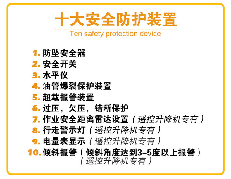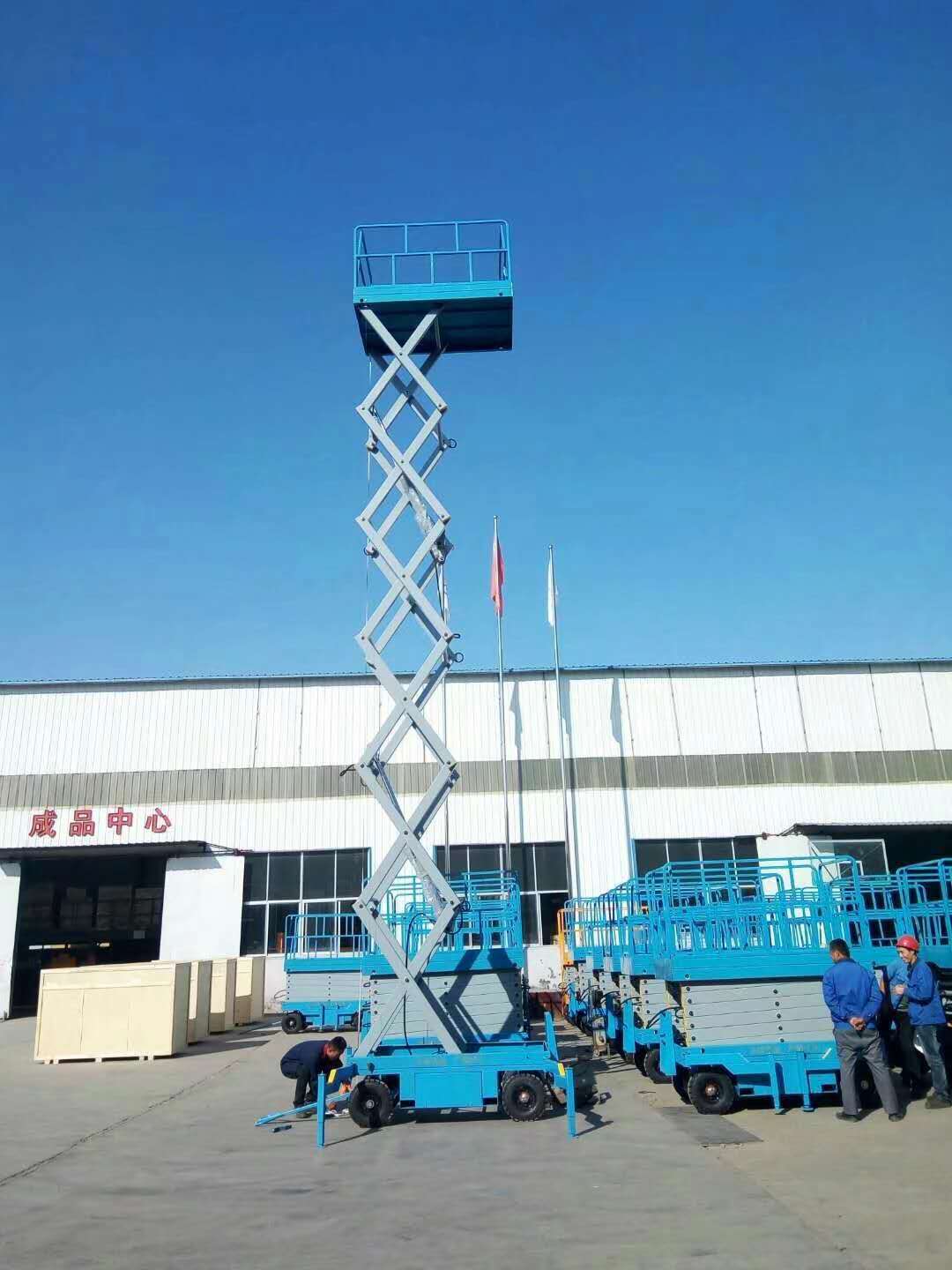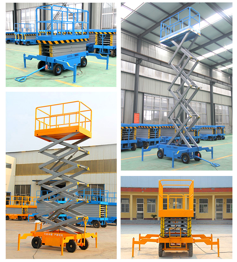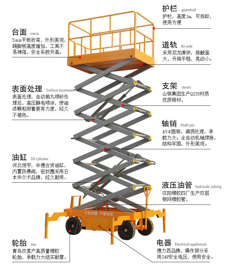 产品应用适用场所:工地、厂房、仓库、粮库、车站、宾馆、机场、码头、加油站、体育场、电力、高架管道等高空设备安装维修、清洁等,还用于起吊设备维护、野外电力设施维护、钢架结构厂房维护等;是您高空作业的好选择。使用方法:1、液压升降平台(以下简称平台)在出厂前均已检验调试,各项技术指标均达到设计要求,使用时只需接通地线,液压、电器系统不需调整。2、平台在使用前要认真检查液压、电器系统无渗漏或现象后方可使用。3、平台在使用时,四个支腿应牢固地支撑在坚实的地面上(以行走轮将要离开地面为准)必要时可使用枕木。4、平台空运行1-3次后方可载荷作业。5、载荷的重心应尽量处于工作台的中心位置。6、防护栏杆两端活动门应关牢销死后方可作业。7、液压控制系统工作过程:首先启动电动机启动开关,电机旋转,齿轮泵打油,油缸伸出,平台起升;待升到需要工作高度,按电机停止按钮,平台停止升降,即可作业。下降时,按电磁铁接通按钮,此时,油缸回油接通,平台靠自重下降,待降至原始位置后,关闭电磁铁(断电)。注意事项:1、 平台在使用时,工作台面应保持水平状态。2、 室外作业时,五米以上平台应系安全绳。3、 平台在升降过程中,严禁任何人员攀爬,若需维修,平台升起后将平台顶牢方可进行。4、 平台升起后不得移动,四个支腿未支撑紧不得升起作业。5、 平台在使用过程中严禁超载作业,所载物品应安全放置在工作台上,不得移动。6、 所用液压油应保持清洁,不得混入水及其它杂质,一般每半年更换一次。液压油一般冬季用N32号;夏季用N46号。7、 当平台出现故障时应及时切断动力电源进行维修。