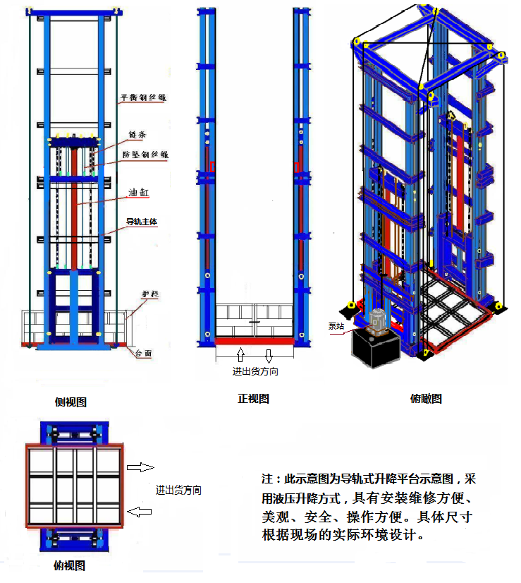 大承载10吨,实现多点控制,上下楼层互动联锁,达到安全使用;提升高度高,采用旁置油缸、或双测式油缸,运行平稳、无噪声、维修方便、使用寿命较长;停电手动下降、紧急停止按钮,方便、快捷、实用; 地坑深度一般为15cm-30cm,顶层高度不受限制,可根据现场环境定做用;层门可贯通,厂房内外可相互戳开,方便、节省空间;特别适合2-3层钢结构厂房,内外部均可使用。